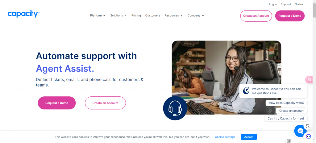 Capacity's AI knowledge base uses machine learning to provide expansive question coverage through an automated inquiry generator. It also offers alerts to verify the accuracy of answers and provides a universal knowledge base accessible through chat.