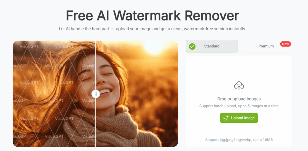 VisualGPT is a versatile workhorse that excels at both photo and video watermark removal. Its standout feature is dynamic watermark tracking—perfect for videos where the logo moves (like TikTok clips). We tested it with a video that had a shifting watermark, and VisualGPT tracked it frame by frame, removing it without glitches. It also offers extra features like AI enhancement and format conversion, so you can edit and optimize in one place.