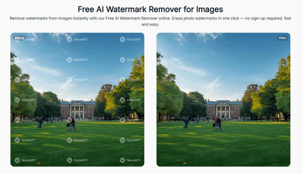 NoteGPT leads our list for its exceptional removal quality and user-friendly design as a top-tier AI Watermark Remover. This tool uses advanced deep learning to erase watermarks from both photos and videos, leaving zero traces. We tested it with a complex landscape photo with a semi-transparent watermark, and the result looked identical to the original—no blurs, no color mismatches. NoteGPT preserves 4K and 8K quality, making it perfect for professionals who need crisp content.