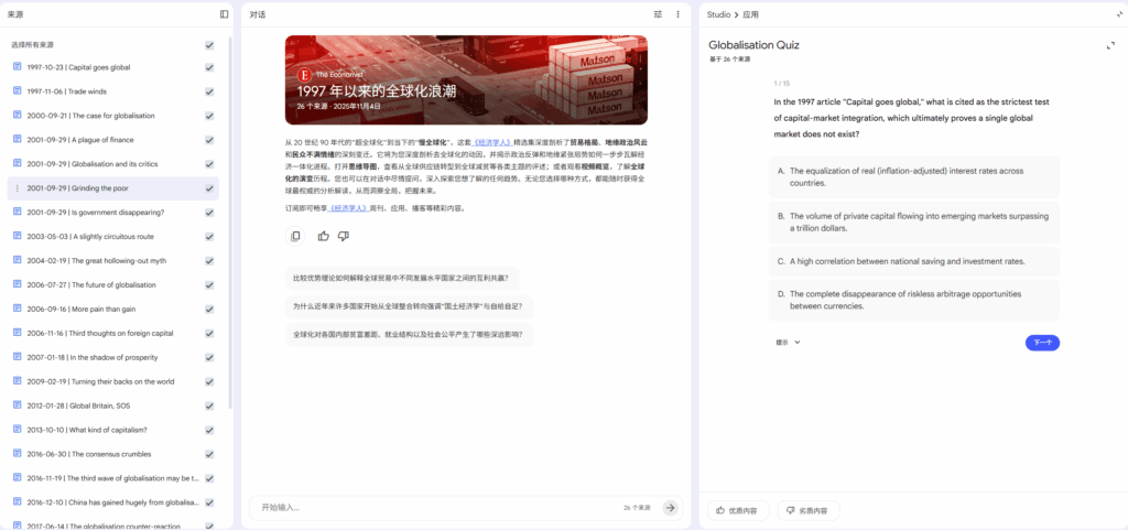 Google’s NotebookLM brings a unique edge to quiz tools: deep integration with your existing content. If you have lecture notes, training manuals, or research docs, it can turn them into quizzes almost magically—simply upload or connect your files, tell it what kind of quiz you need, and it generates relevant questions that test genuine understanding (not just memorization), even from complex materials.