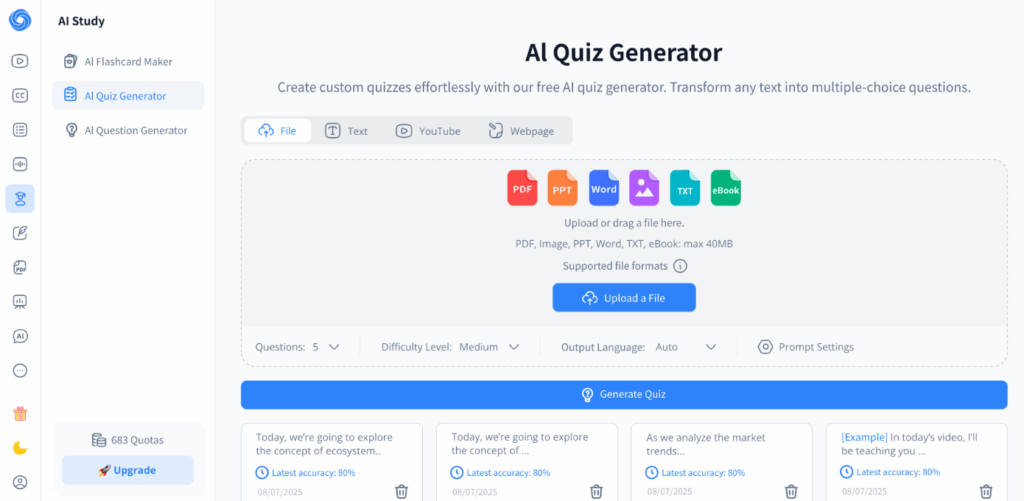 One feature that teachers love is the automatic difficulty adjustment. The tool can create multiple versions of the same quiz at different difficulty levels. This means you can support both struggling students and advanced learners without creating separate quizzes from scratch. It’s features like this that show how a smart AI Quiz Generator can save you hours of work.